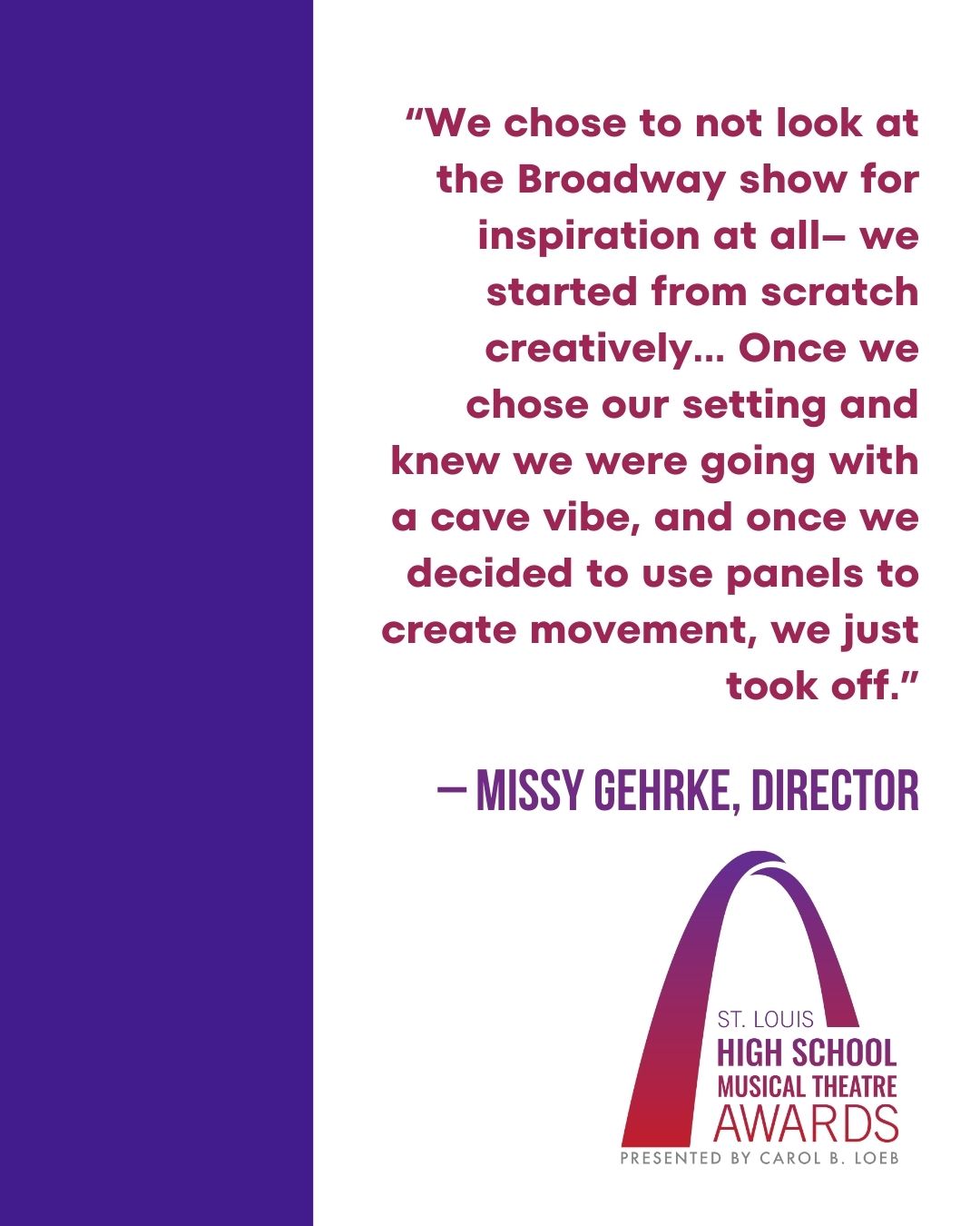 “One of the requirements of the contract was to do wholly original creative choices. We chose to not look at the Broadway show for inspiration at all– we started from scratch creatively. We had to figure out how to incorporate movement and make it feel as though our characters were on a long journey (without a turntable), and we needed to figure out our unique setting. Once we chose our setting and knew we were going with a cave vibe, and once we decided to use panels to create movement, we just took off,” Gehrke said.