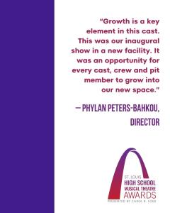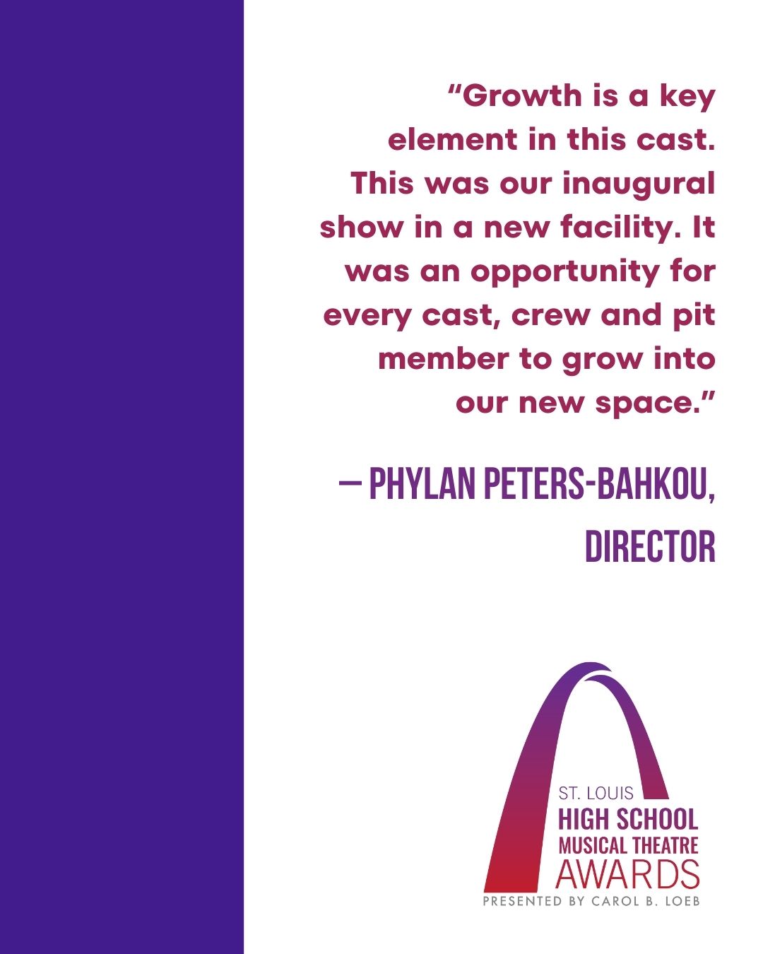“I have watched them fill roles on stage and off. No job is too big or too small for any one of them to step into. Growth is a key element in this cast. This was our inaugural show in a new facility. It was an opportunity for every cast, crew and pit member to grow into our new space,” Peters-Bahkou said.